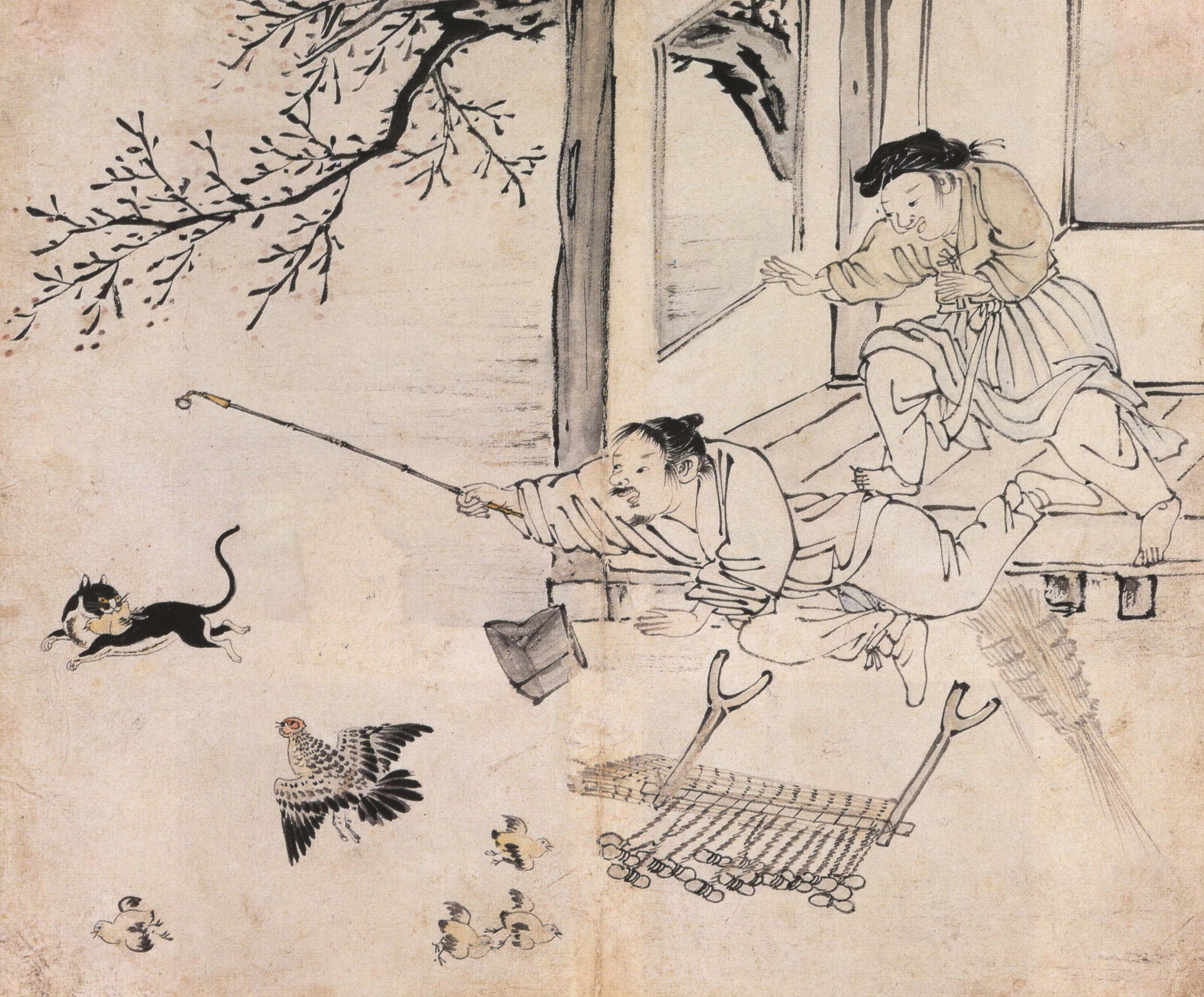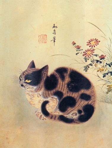 단원 김홍도의 영모화, 한가로이 노는 두마리의 강아지들을 자애로운 눈빛으로 바라보는 어미개를 그렸다.