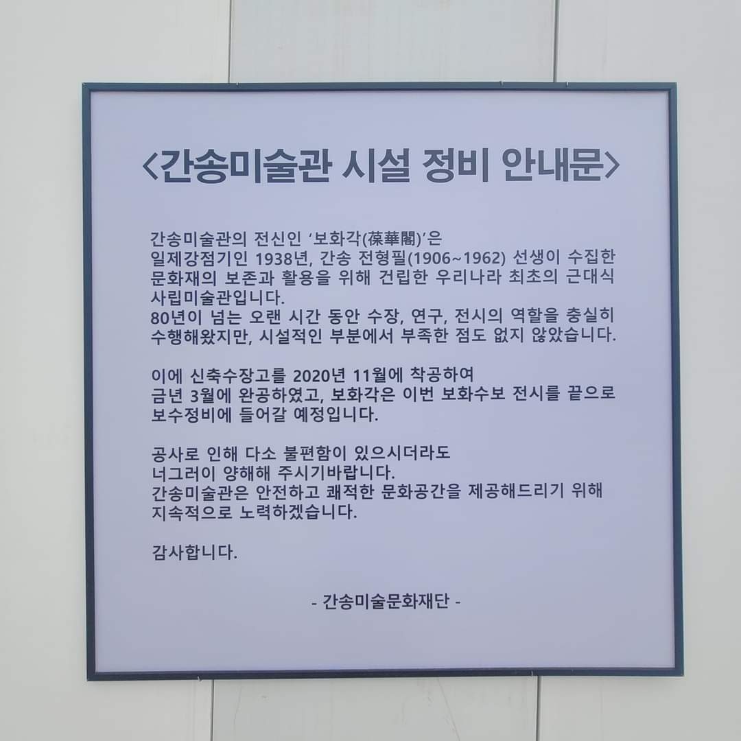 간송미술관은 대한민국 최초의 근대식 사립박물관로 1938년 간송 전형필 선생이 설립한 보화각(葆華閣)이 전신이며, 1966년 간송미술관과 한국민족미술연구소 체제로 변경되었다.
