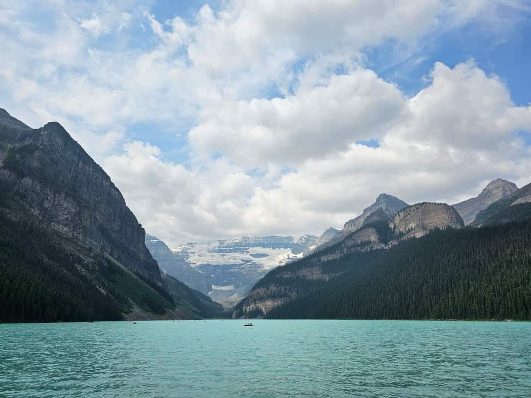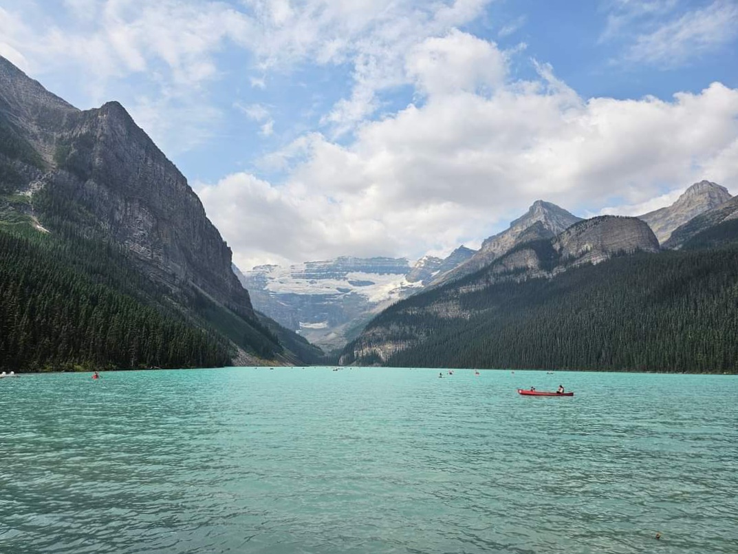 Mount Rundle through the haze of wildfire smoke, as seen from the middle of Vermilion Lake one