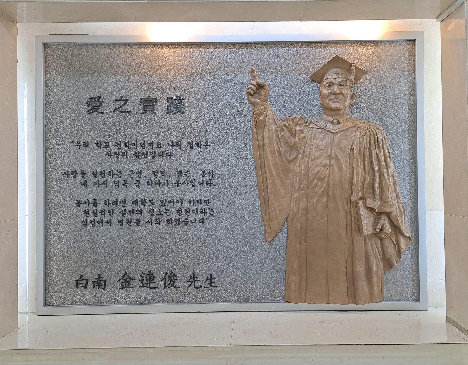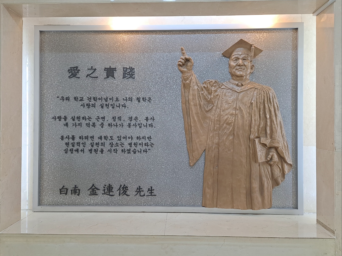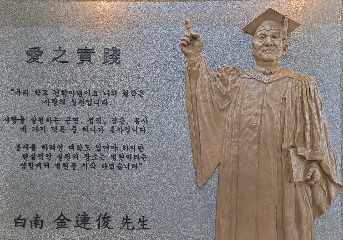한양대 설립자 백남 김연준 : 사랑의 실천 명판, 한양대학교 병원 류마티스병원 1층 입구