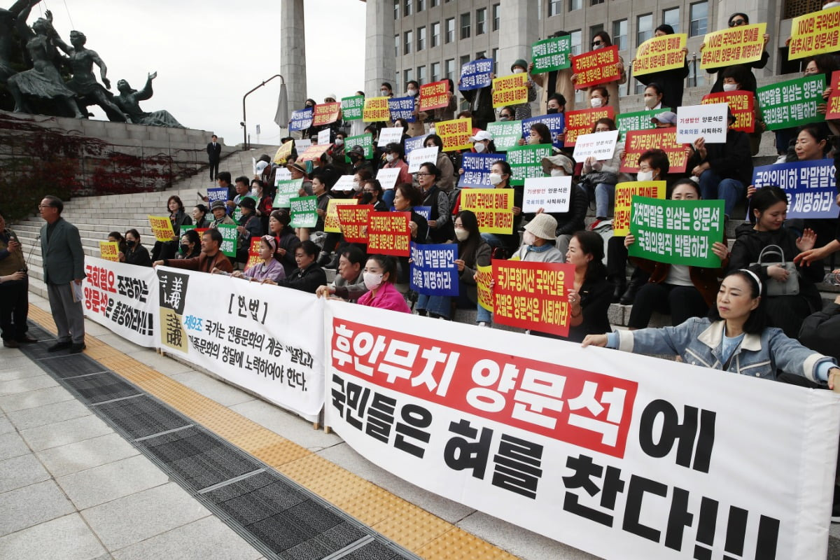 "제자에 미안해"…국악인들 '기생집 발언' 野양문석 규탄대회 열었다, 국악인 70여명, 양문석 '국회의원직 제명' 요구 "국악 전공하는 딸이 아빠를 원망하더라"