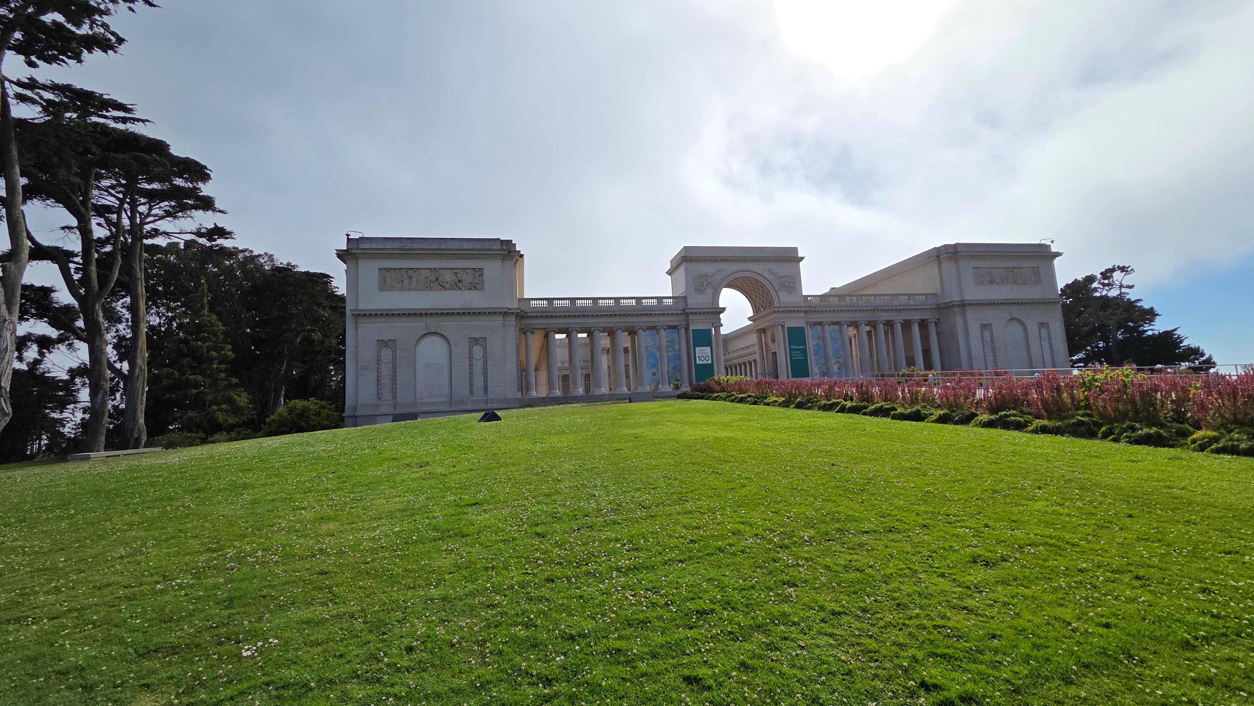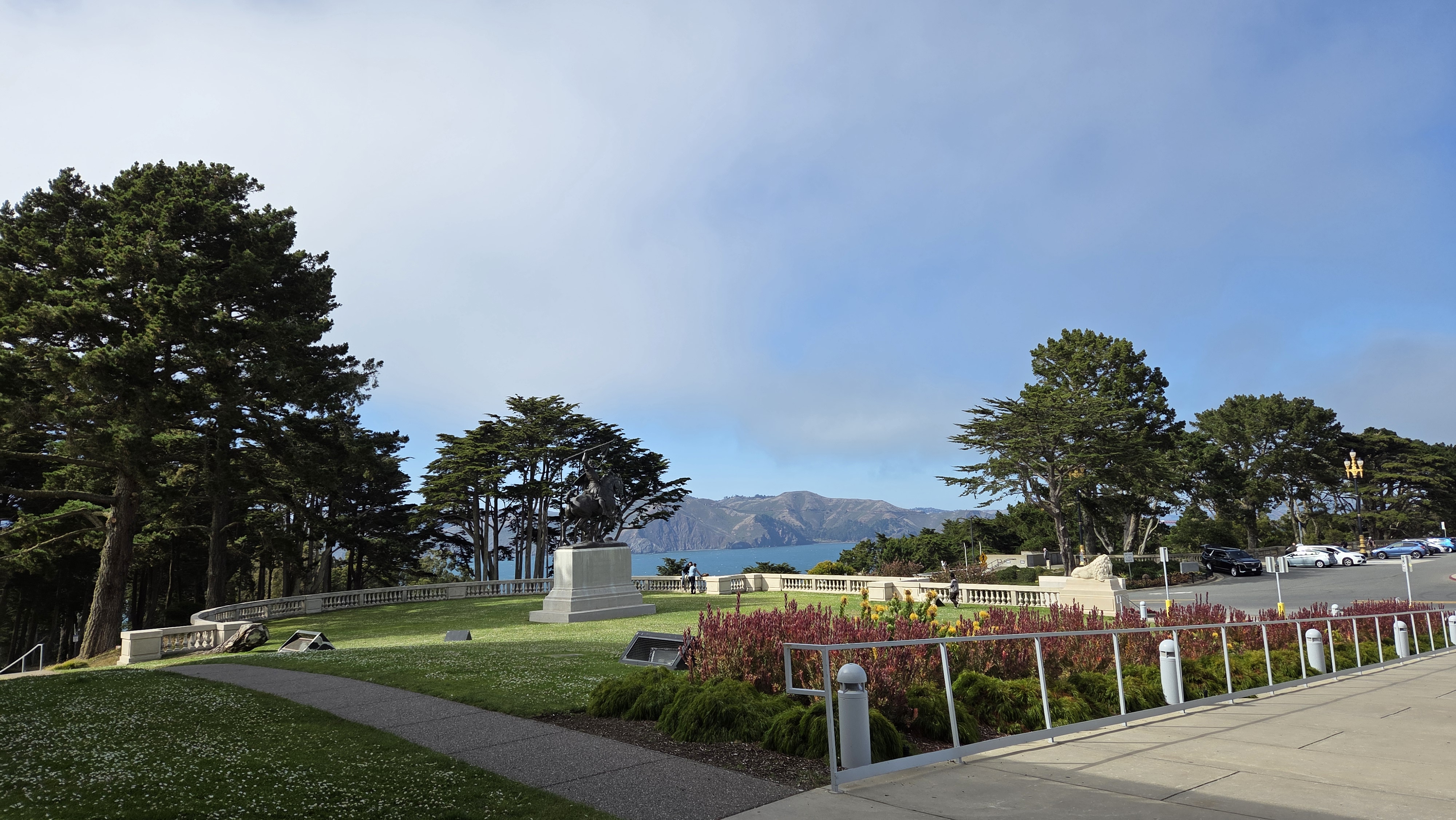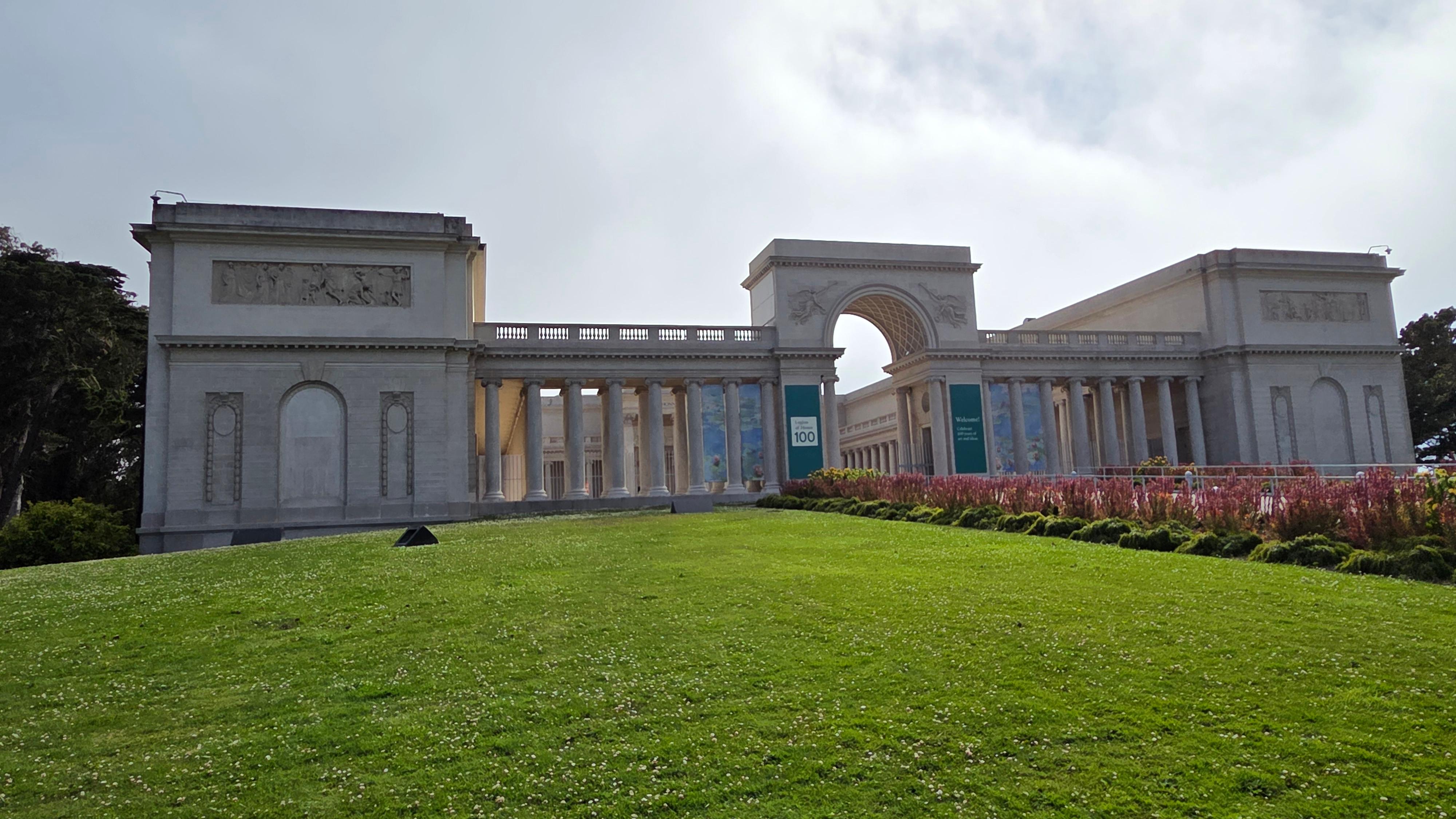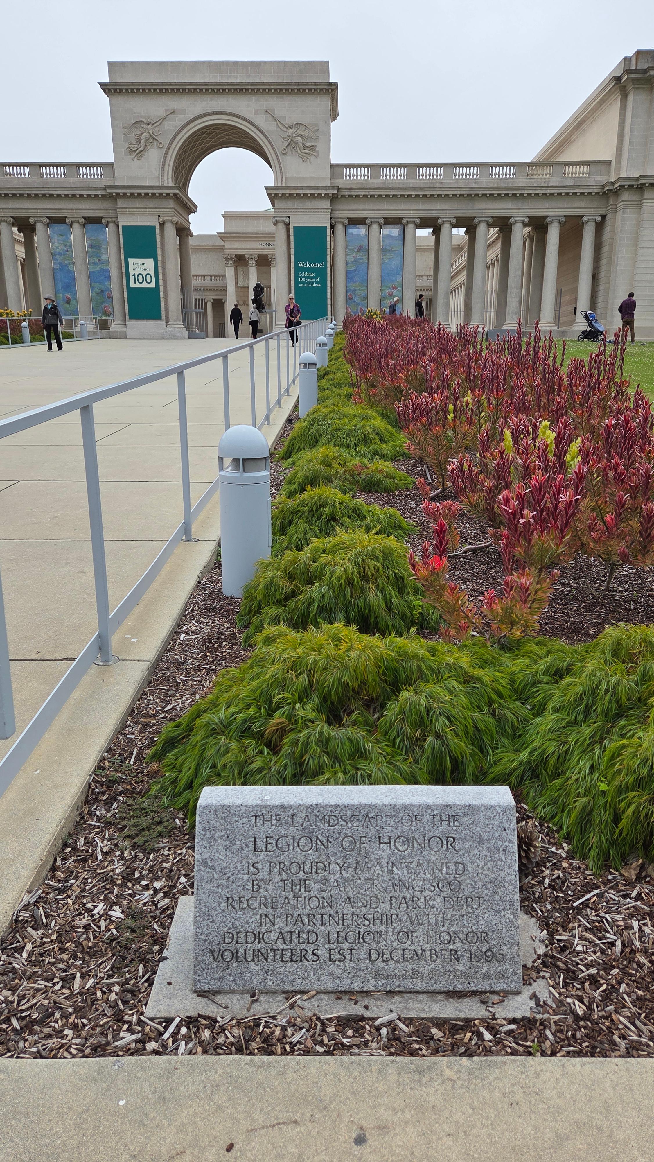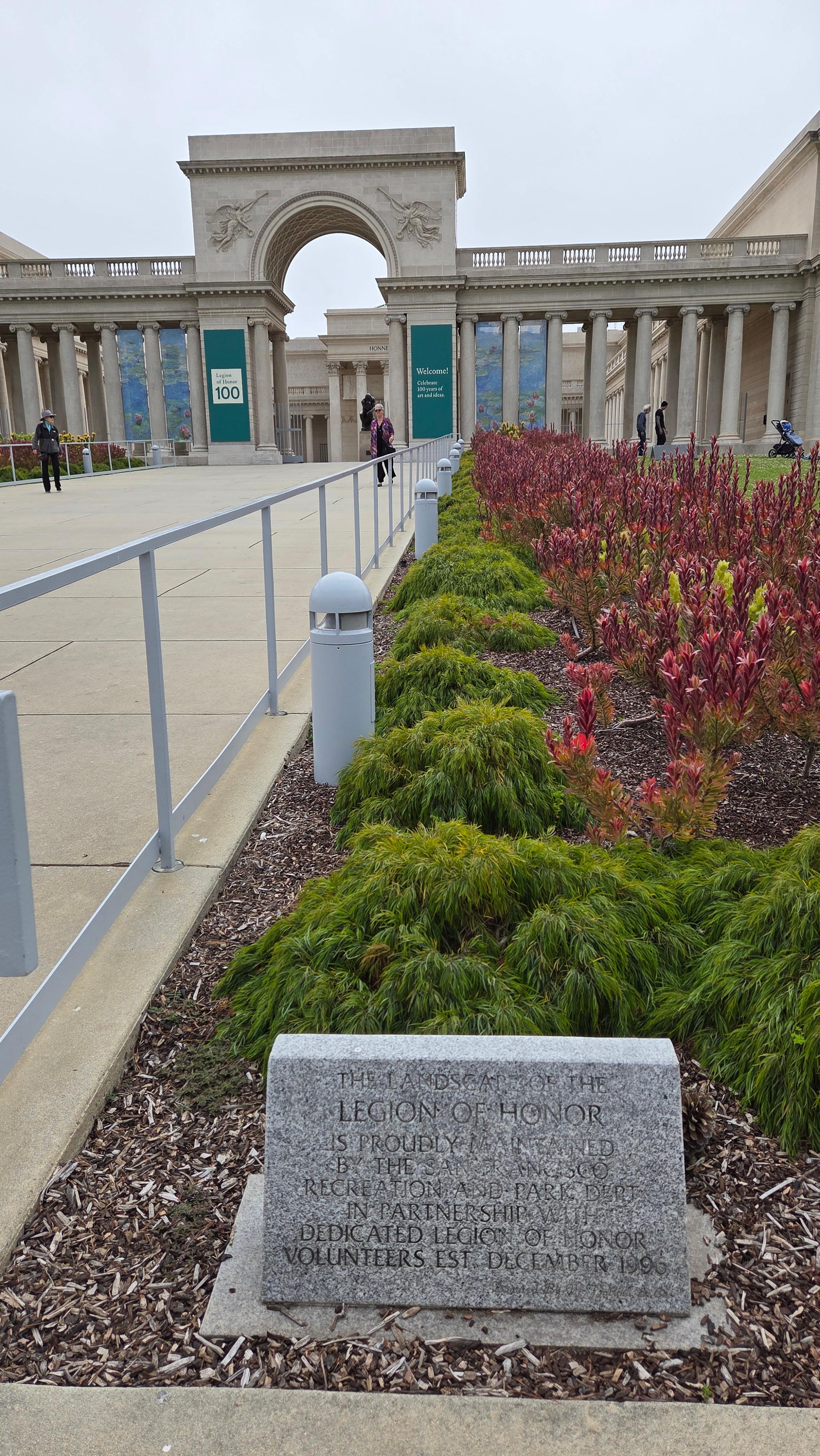 리전 오브 아너(Legion of Honor) 입구에는 미술관을 바라보면 오른쪽에 20세기 초 뉴욕의 가장 저명한 조각가 중 한 명이었던 미국의 조각가 안나 하얏트 헌팅턴(Anna Hyatt Huntington, 1876 – 1973)이 제작하고 1927년에 제작한 스페인 발렌시아의 통치자 엘 시드 캄페아도르(El Cid Campeador, 본명 로드리고 디아스 데 비바르, Rodrigo Díaz de Vivar, 1040~1099) 동상이 서 있고, 왼쪽에 프랑스의 수호성인 잔 다르크(Jeanne d'Arc, Joan of Arc, 1412~1431) 동상이 세워져 있다. 동상은 정면으로 골든 게이트(Golden Gate) 조망 장소로 유명한 소살리토 남쪽의 회색의 높은 언덕인 마린 헤드랜(Marin Headlands)와 골든 게이트(Golden Gate)로 들어가는 태평양이 보인다.