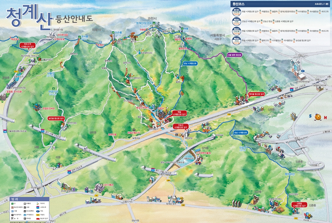 청계산 : 매바위(578m), 매봉(582.5m), 소원 바위로 유명한 돌문바위(매봉에서 약 200m, 세 바퀴를 돌면 청계산의 정기를 받을 수 있다는 설)
