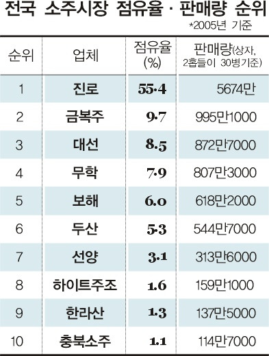 [위기의 소주…'순한' 변신]참이슬·처음처럼 전국 소주 시장 점유율 70% 넘겨, 지역 소주회사들 경영난에 허덕