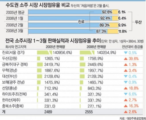 진로의 ‘수성(守城)’이냐, 두산의 ‘약진’이냐. 소주업계의 대표주자 진로(참이슬)와 두산(처음처럼)이 2월초 앞서거니 뒤서거니 신제품을 내놓은 이후 시장의 반응을 초조하게 기다리고 있